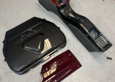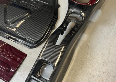 For this project, we hydro dipped a selection of engine plastics and interior trims in a striking combination of red and black carbon fibre.