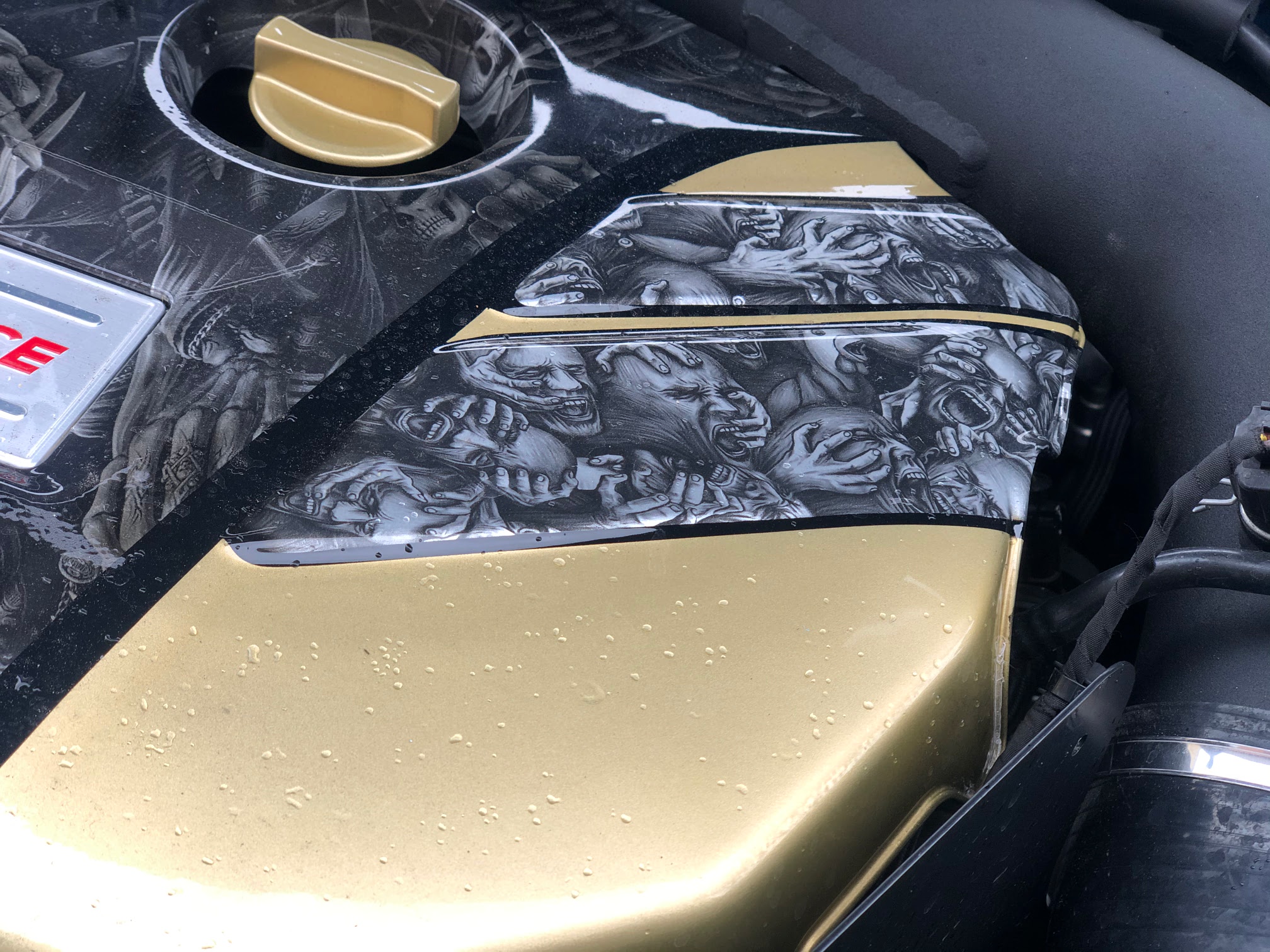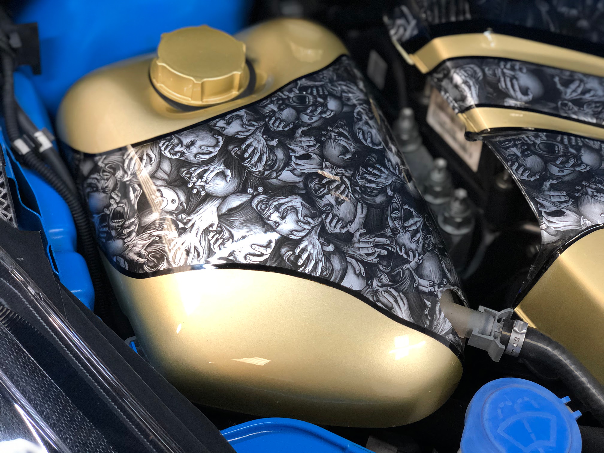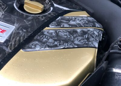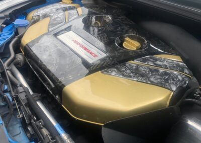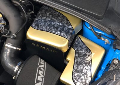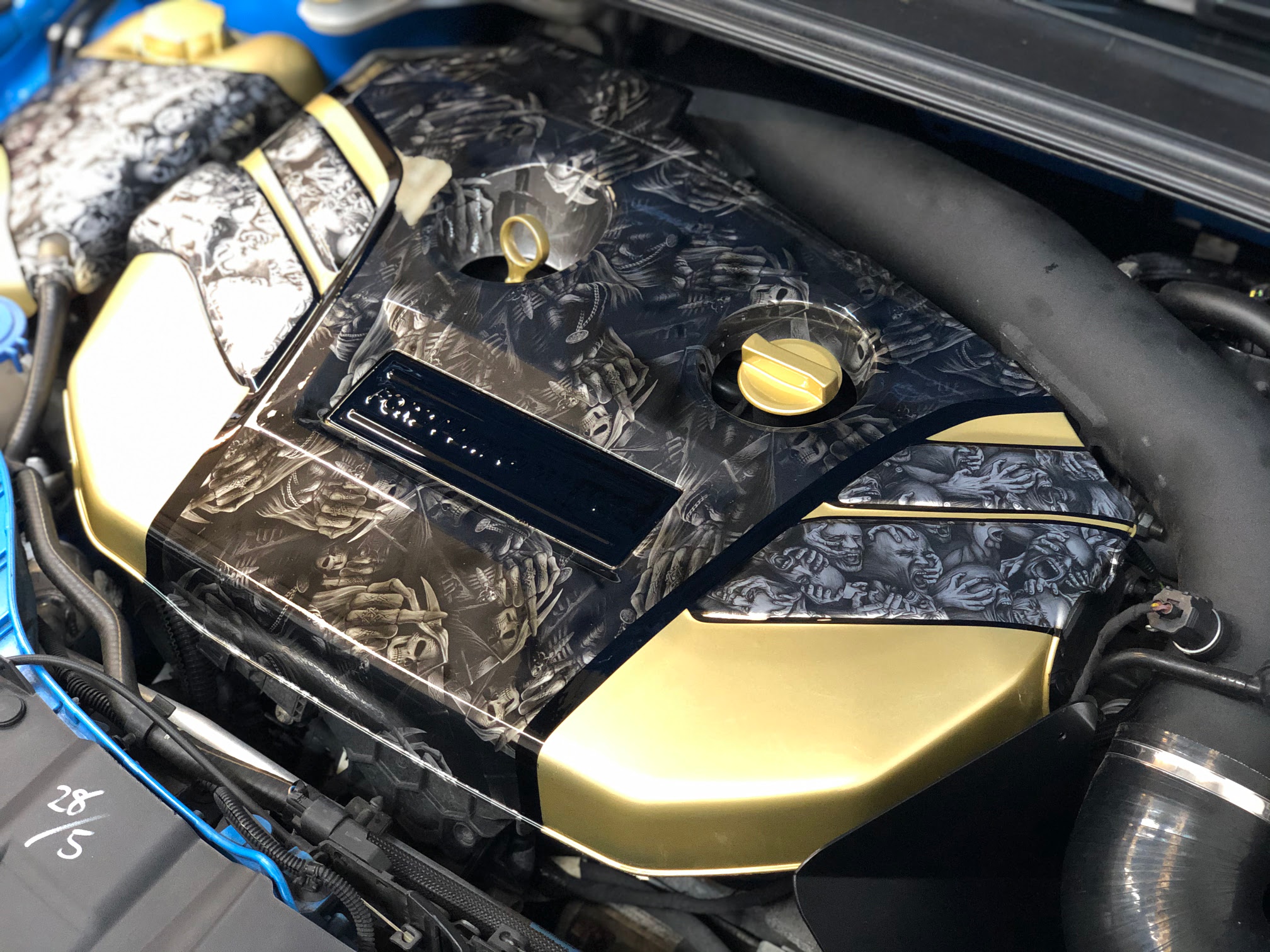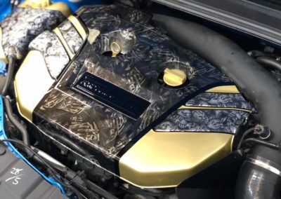 The bodykit and alloy wheels were hydro dipped in gold carbon fibre. The interior was hydro dipped in dark carbon fibre. The engine bay was a custom design created by Vital owner Adam Cunningham.
