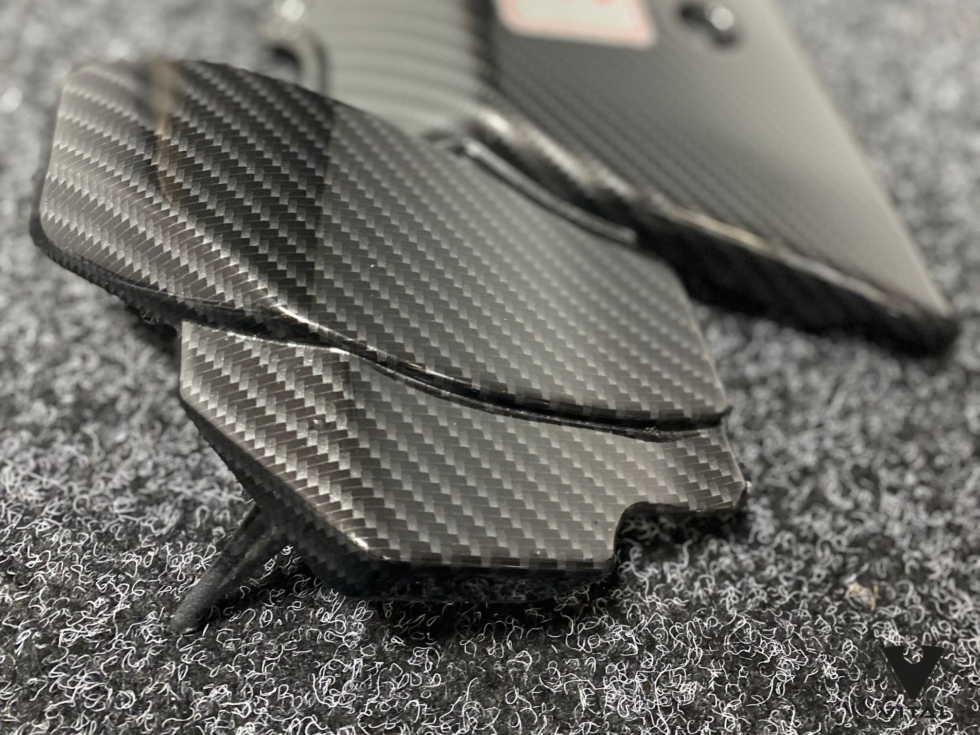 Once the carbon base was finished, we added clean red accent lines to bring out the Type-R colour theme. The stripes were masked and painted with precision so they sit perfectly straight within the weave, adding a bit of contrast without overpowering the part.