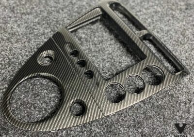 After prepping and priming, we applied our carbon fibre pattern, making sure the lines flowed naturally around the curves and recesses. The final clear coat added depth and a high-quality gloss, completely transforming the look of the dashboard area without altering the original fit or function of the part.