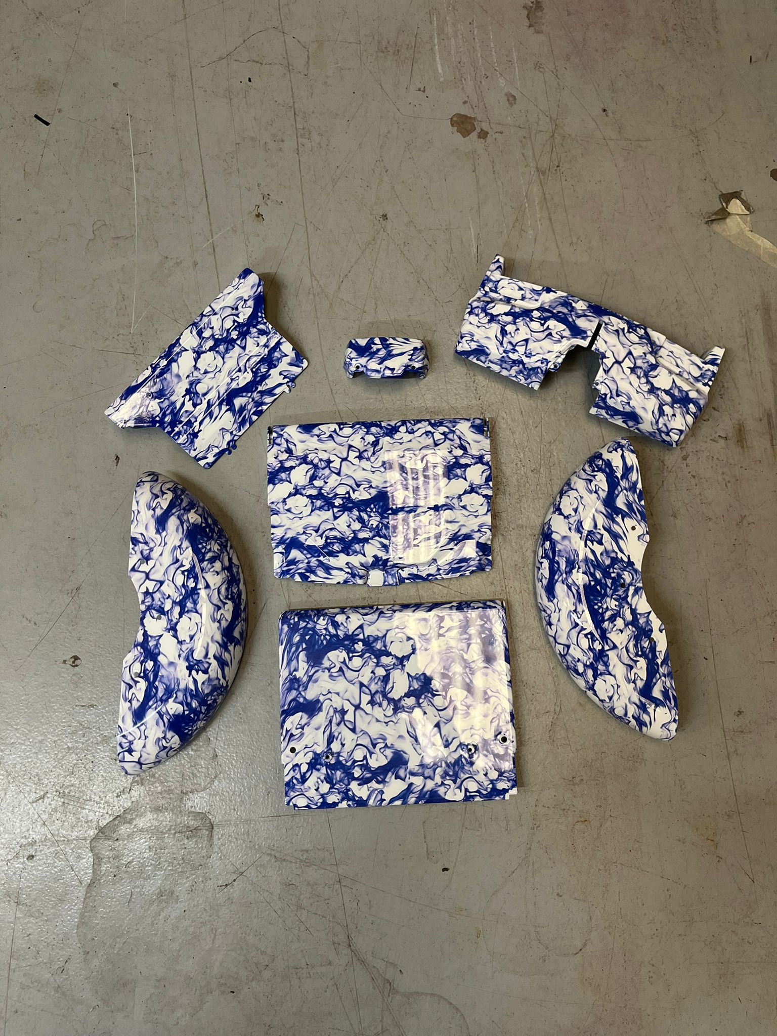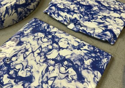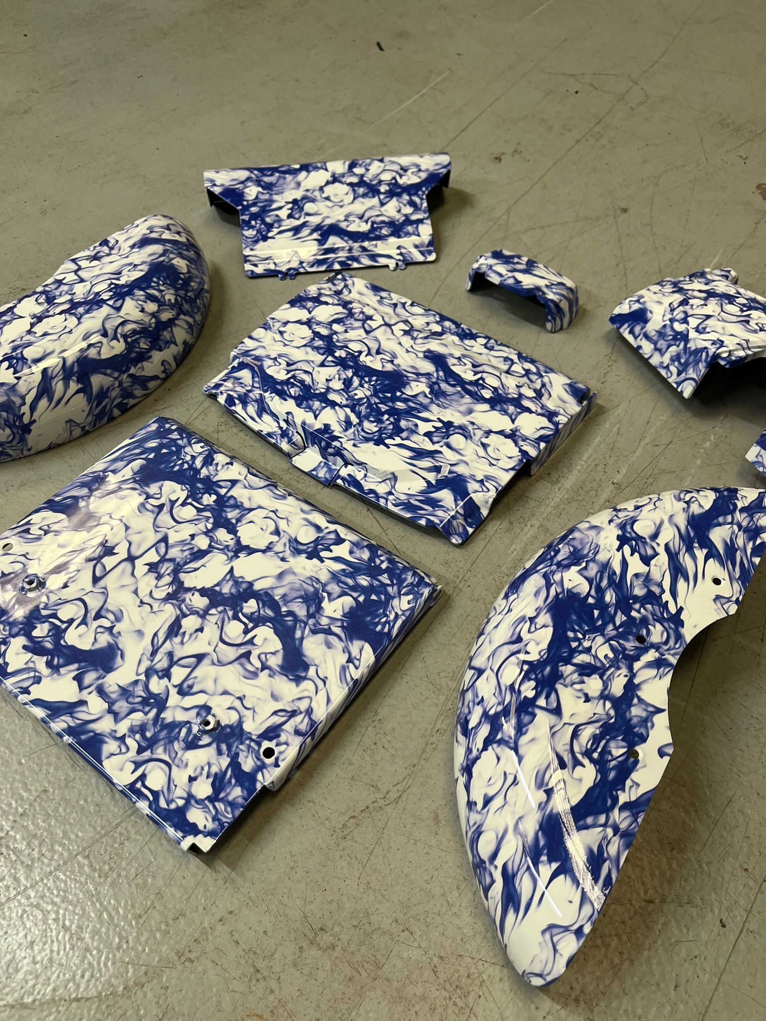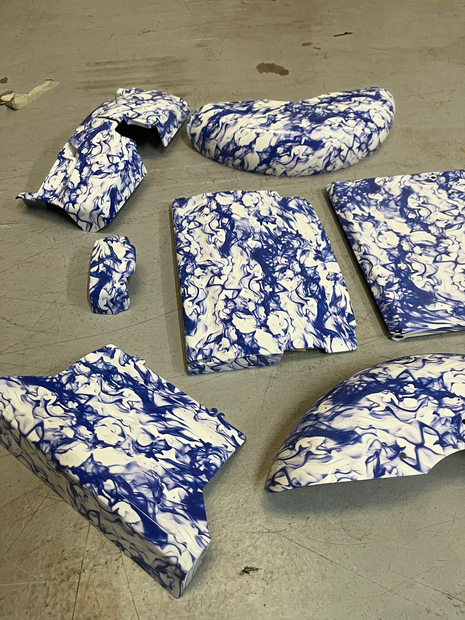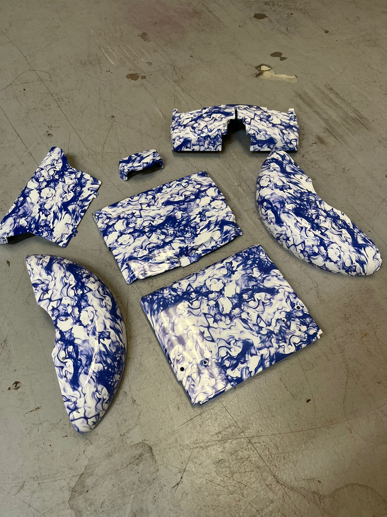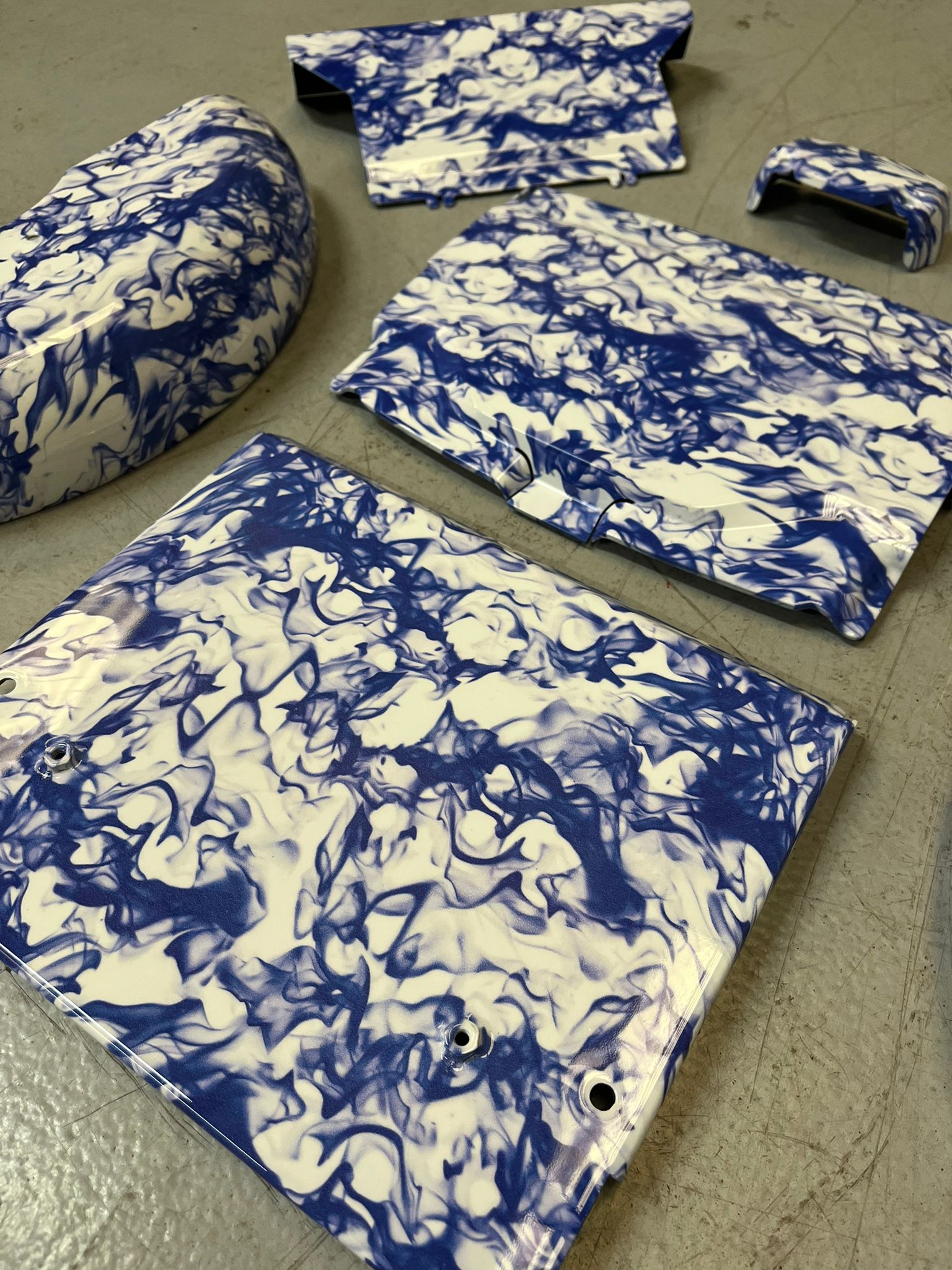 The pattern flows smoothly across every piece, creating a unified and premium finish that stands out while still being practical for everyday use. A great example of how hydro dipping can transform essential equipment into something personal, stylish and entirely unique.